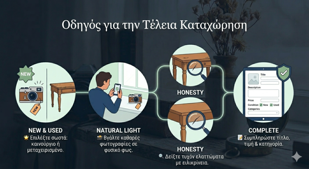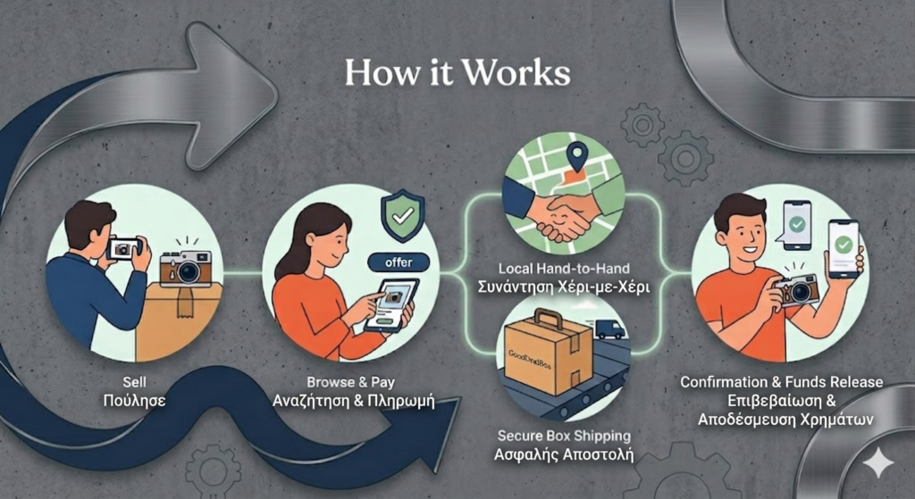 🔒 Ασφαλής Πληρωμή (QR Code): Πληρώνεις online με την κάρτα σου κατά την αγορά. Τα χρήματα είναι ασφαλή στον «ψηφιακό κουμπαρά» (escrow) της Stripe. Στη συνάντηση, αφού ελέγξεις το αντικείμενο, σκανάρεις το QR code του πωλητή για να αποδεσμευτούν τα χρήματα. Αυτή η επιλογή προσφέρει απόλυτη ασφάλεια.